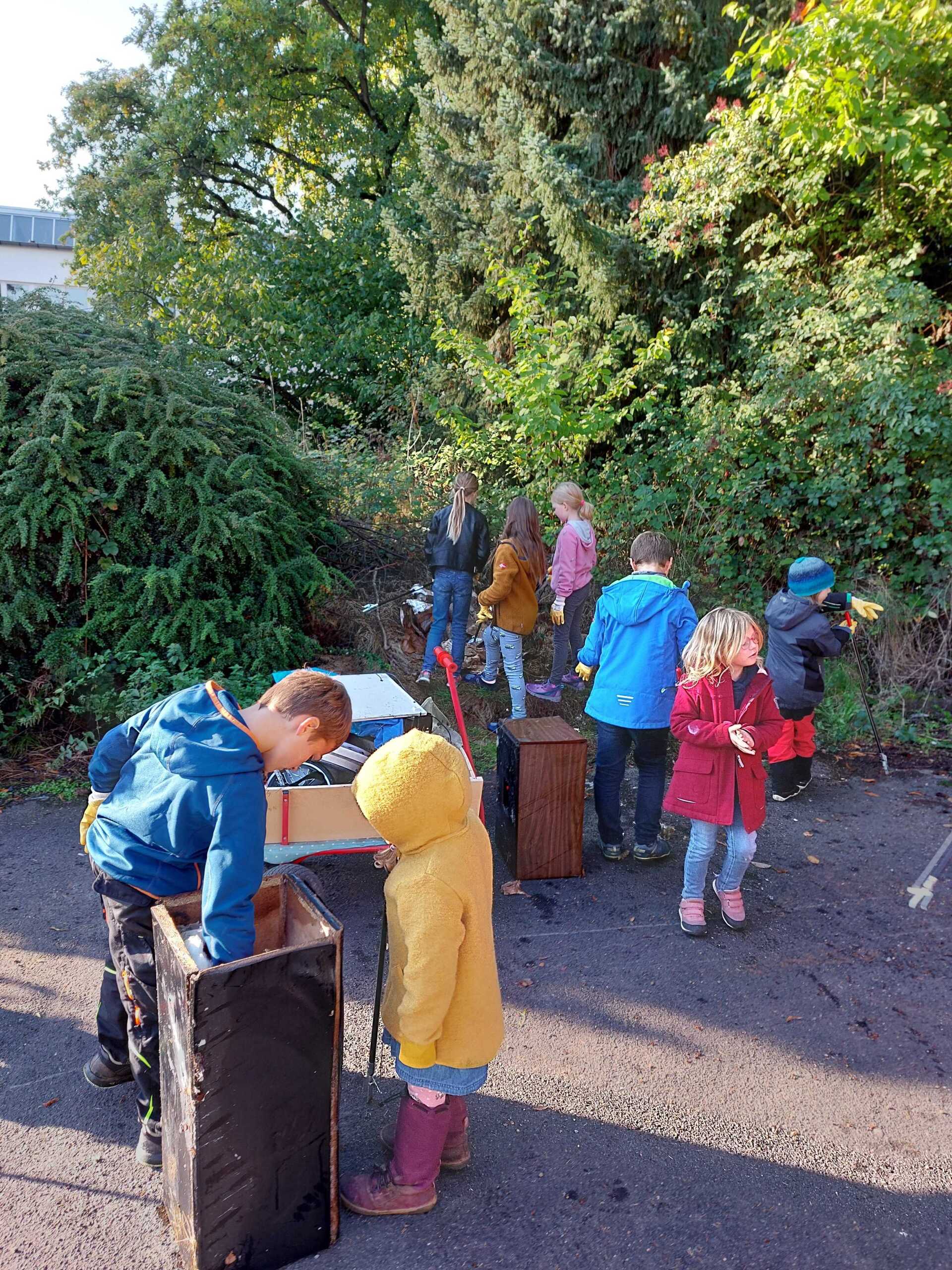 Unser Kunstwort „Plandern“ ist an das Plogging angelehnt und verbindet das schwedische „PLOCKA = Aufheben“ mit dem WANDERN. Wie schon im letzten Jahr wurden die Kinder der Freien Schule Rhein-Sieg als MüllsammelhelferInnen vom Bauhof der Stadt Hennef mit Handschuhen und Greifzangen perfekt für die Plandertour ausgestattet. Während die Dritt- und ViertklässlerInnen der Tintenklecksklasse den Weg vom Pennymarkt bis zur Autobahnbrücke vom Müll befreiten, gingen die jüngeren Kinder vom Wanderparkplatz an der Siegbrücke los. Die Morgenkälte wurde durch die Sonne langsam vertrieben. Die Kinder staunten über die prächtige Herbstmorgenstimmung an den Siegwiesen. Später staunten sie über den Müll, den manche Menschen verursachen. So konnten manche schweren Dinge wie eine Bildschirmrückwand, ein Gullideckel und ein Wellblech mit den Bollerwagen kaum transportiert werden. Sonnen-, Regenschirm und Yogamatte sowie jede Menge Flaschen waren dagegen leicht zu bergen und mitzunehmen. Unter der Autobahnbrücke fanden die Kinder wie schon im letzten Jahr jede Menge Kronkorken. Diese sammelten sie separat in einer Schatzkiste. Der Schatz wird in Kürze zu einer Sammelstelle in Hennef gebracht. Eine Initiative in Königswinter verkauft den Rohstoff und unterstützt krebskranke Kinder damit. Unter der Autobahnbrücke machten die Kinder eine weitere Entdeckung: Fledermauskästen, die stark beschädigt sind, vermutlich durch Steinwürfe. Sie wollen beim Umweltamt nachfragen, ob es für die Fledermäuse nicht einen besseren Schutz geben kann. Die Drachenklasse machte sich auf der Plandertour rund um unsere gemieteten Schulräume nützlich. Eine Familie hatte kurz zuvor eine wilde Müllkippe entdeckt und die Säuberung für den Weltlernentag vorgeschlagen. Ungeahnte Mengen von Müll tauchten mitten im Wohngebiet am Abtshof auf. Die Kinder fragten sich, warum der Müll nicht einfach auf legalem Wege entsorgt werden kann. Eine sehr gute Frage. Vielleicht nützt an dieser Stelle ein Schild?