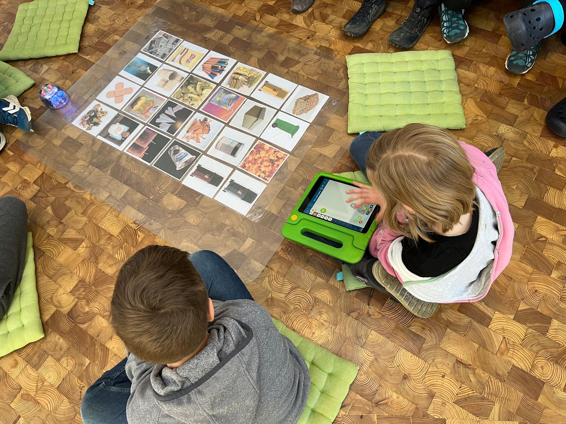 In kleinen Gruppen von ca. 6 Kindern konnten sie auf vorbereiteten Matten mit den Minirobotern Müll zur richtigen Tonne bringen, Wege von Ort zu Ort in Hennef abgehen und die Buchstaben ihres Namens abfahren.